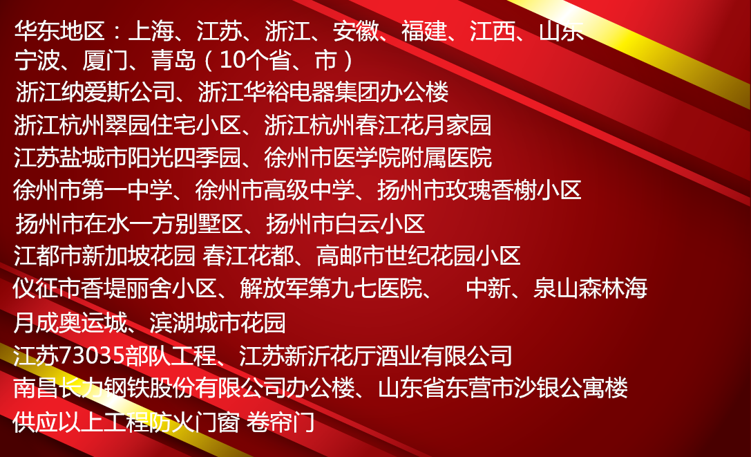 浙江纳爱斯公司、浙江华裕电器集团办公楼、浙江杭州翠园住宅小区、浙江杭州春江花月家园、江苏盐城市阳光四季园、徐州市医学院附属医院、徐州市第一中学、徐州市高级中学、扬州市玫瑰香榭小区、扬州市在水一方别墅区、扬州市白云小区、江都市新加坡花园 春江花都、高邮市世纪花园小区、仪征市香堤丽舍小区、解放军第九七医院、 中新、泉山森林海 、月成奥运城、滨湖城市花园、绿地世纪城、管道公寓、汉府雅园、霖雨山庄、江苏73035部队工程、江苏新沂花厅酒业有限公司、南昌风之语广告股份有限公司、南昌市劳动宾馆、南昌江西宾馆、南昌国贸酒店、诚志股份有限公司办公楼、南昌长力钢铁股份有限公司办公楼、山东省东营市沙银公寓楼、山东沂源钢城区信发公司、山东文登东安黑豹股份有限公司、山东文登大水泊崇合果蔬公司、山东文登中和花园小区、山东省聊城花平信诚纸业办公室